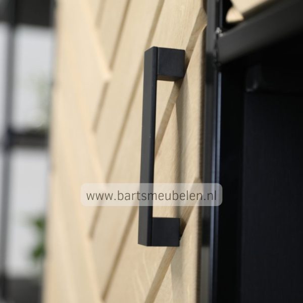 Verder is de industriele wandkast uitgerust met maar liefst 9 lades, 6 deuren met visgraat motief en diverse open vakken. De lades en deuren hebben handgemaakte handgrepen die in dezelfde kleur worden behandeld als het frame.