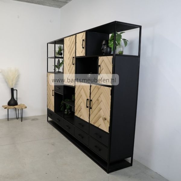 Deze stalen visgraat kast eiken is waanzinnig! Een stalen frame die is ingelegd met rustiek eikenhout. De eikenhouten ladefronten zijn zwart geverfd, de deuren hebben een visgraat patroon en er zijn ook voldoende open vakken. Bekijk dit model ook als: zwarte wandkast met visgraat motief.