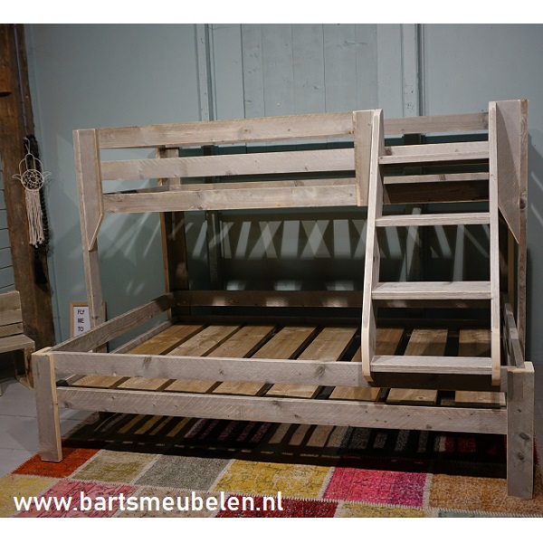 Steigerhouten stapelbed 3 persoons Laura op de foto heeft boven de standaard matrasmaat van 90x200cm en onder de matrasmaat cm.