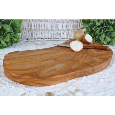 Houten snijplank rustiek ca. 40 – 44 cm gemaakt van olijfhout. Deze snijplank met veel karakter kan heel goed gebruikt worden als dagelijkse snijplank in de keuken. Maar ook als rustieke snackplank is hij uitstekend geschikt. Het bijzondere aan dit bord is dat er is geprobeerd de oorspronkelijke groei van de olijfboom zoveel mogelijk te behouden. Lengte ca. 40 – 44 cm, breedte ca. 16 – 20 cm.