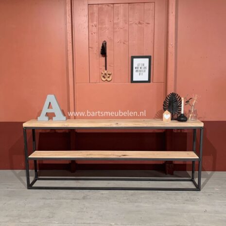 Sidetable industrieel Jort is een stoere wandtafel van eikenhout en staal. Een open dressoir voor een luchtig effect. Perfect te combineren met andere meubelstukken. Bovendien stel je hem hier volledig op maat samen.