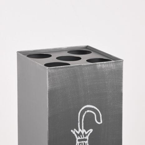 De parapluhouder, gemaakt van hoogwaardig metaal is uitgevoerd in de kleur antiek grijs en voorzien van een stoere, vintage print. In de top zitten 5 uitgespaarde cirkels waar de paraplu’s ingezet kunnen worden wat zorgt voor een extra nette en opgeruimde gang.