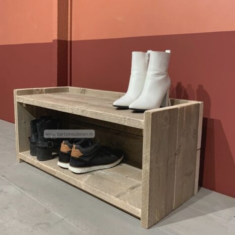 Dit steigerhouten schoenen kastje op de foto is 90 cm breed. Verder heeft hij de standaard afmetingen zoals hier beschreven. Het schoenen kastje is gemaakt van old-look steigerhout en heeft geen kleurbehandeling gehad.