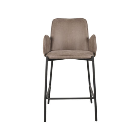 Barkruk Joni, uitgevoerd in taupe micro suède heeft een luxe ronde zitting, rugleuning en is in het bezit van armleuningen. Deze combinatie maakt Joni een luxe barkruk met ontzettend veel comfort. De armleuningen lopen achter de rugleuning langs waardoor de barkruk een uniek uiterlijk krijgt en er ook nog eens ontzettend leuk uitziet aan de achterkant. Dat is natuurlijk een fijne bijkomstigheid als de barkrukken aangeschoven staan aan tafel of een bar. Het ranke maar doorlopende zwarte frame waar de zitting als ware op rust geeft de barkruk een luchtige uitstraling. Het U-frame zorgt voor een makkelijke op- en afstap en dient als voetensteun. De uiteinde van het frame loopt op vier zijdes een klein stukje door wat zorgt voor een speels effect.