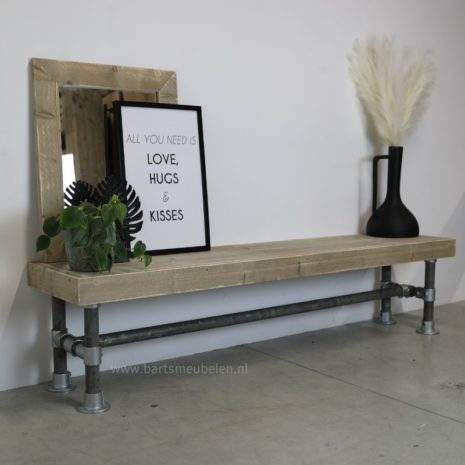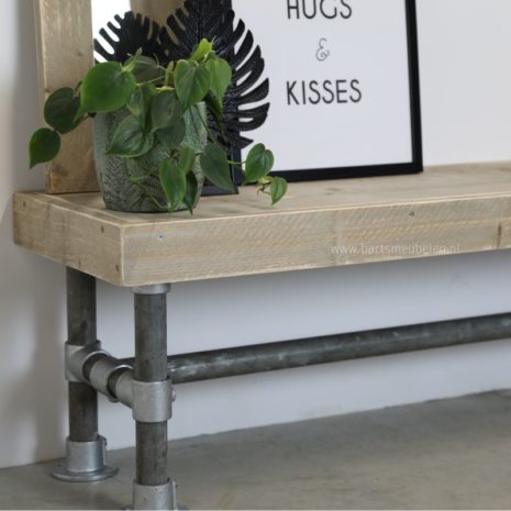 Stoer, stevig en industrieel door de combinatie van gebruikte steigerbuis met een steigerhouten zitting. Nog op zoek naar een stoere bank voor in uw woning of hal? Kijk dan eens naar deze bank.