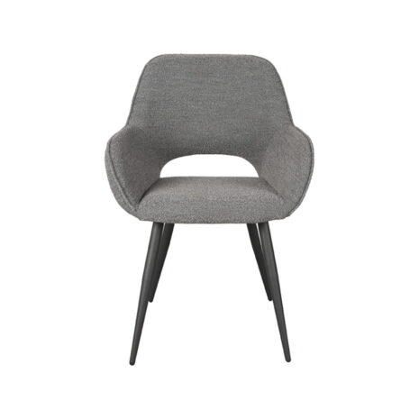Fer, uitgevoerd in grijs bouclé heeft een ronde zitting voorzien van elegante rondingen. De mooie ‘curve’ van de zitting naar de arm- en rugleuning geeft deze stoel ontzettend veel charme en comfort. De fraaie uitsparing in de rugleuning geeft de stoel een luchtig en speels karakter. De zwarte, naar buiten staande poten zorgen ervoor dat de stoel lekker stabiel op de grond staat en draagt daarnaast bij aan de leuke speelse touch.