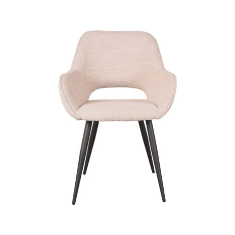 Fer, uitgevoerd in naturel bouclé heeft een ronde zitting voorzien van elegante rondingen. De mooie ‘curve’ van de zitting naar de arm- en rugleuning geeft deze stoel ontzettend veel charme en comfort. De fraaie uitsparing in de rugleuning geeft de stoel een luchtig en speels karakter. De zwarte, naar buiten staande poten zorgen ervoor dat de stoel lekker stabiel op de grond staat en draagt daarnaast bij aan de leuke speelse touch.