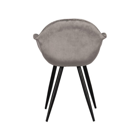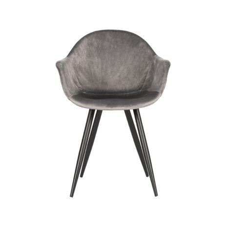Eetkamerstoel Forli, uitgevoerd in grijs kleurig fluweel heeft een zeer luxe en comfortabele kuip voorzien van elegante rondingen en armleuningen. De prachtige duurzame basis als kuip gestoffeerd met het mooiste fluweel zorgt voor een comfortabele, stevige zit. Forli is in het bezit van licht uitlopende poten, uitgevoerd in zwart metaal, waardoor de stoel stevig op de grond staat en ook nog eens een leuke speelse touch krijgt.