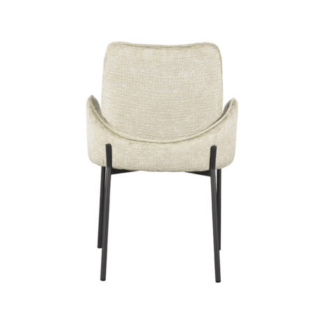 Eetkamerstoel Joni, uitgevoerd in beige elegance heeft een luxe ronde zitting, rugleuning en is in het bezit van armleuningen. Deze combinatie maakt Joni een luxe eetkamerstoel met ontzettend veel comfort. De armleuningen lopen achter de rugleuning langs waardoor de eetkamerstoel een uniek uiterlijk krijgt en er ook nog eens ontzettend leuk uitziet aan de achterkant. Dat is natuurlijk een fijne bijkomstigheid als de eetkamerstoelen aangeschoven staan aan tafel. Het ranke maar doorlopende zwarte frame waar de zitting als ware op rust geeft de eetkamerstoel een luchtige uitstraling. Het uiteinde van het frame loopt op vier zijdes een klein stukje door wat zorgt voor een speels effect.