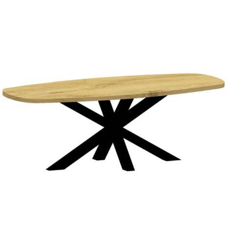 Deze ovalen eettafel deens heeft een massief eikenhouten blad van tussen de 4 en 4,5cm dik in de populaire vorm: deens ovaal. Hieronder staat een stevige mat-zwart stalen spinpoot 8x8cm.