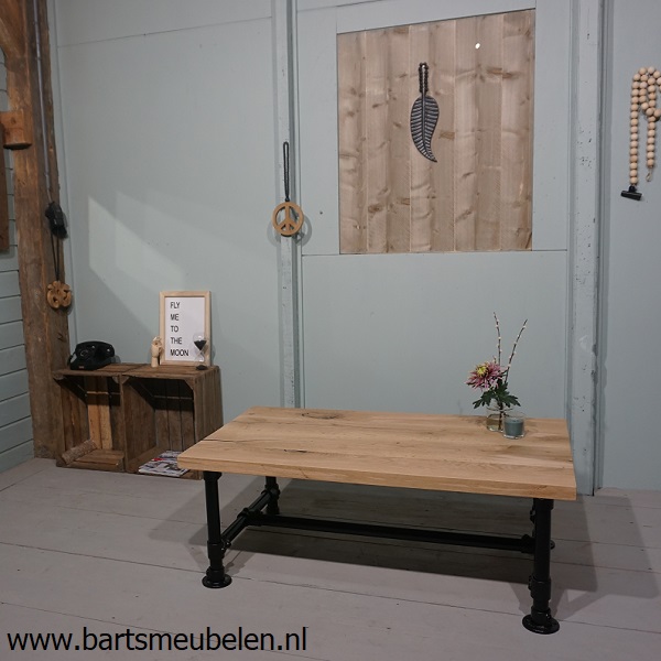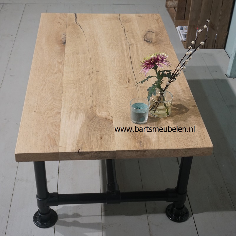 Deze prachtige eikenhouten salontafel Leroy is gemaakt van massieve eikenhouten planken van +/- 40 mm dik en heeft een onderstel van zwart steigerbuis. Tussen de opties kiest u zelf de afmetingen.